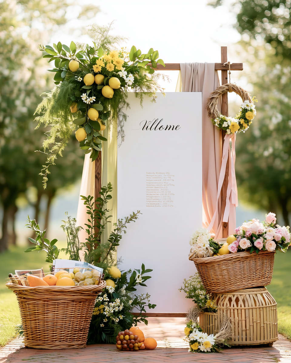 A fresh countryside styling collection inspired by sunlight, citrus accents, soft greenery, and natural floral details. From welcoming entry moments to romantic ceremony structures and beautifully styled celebration tables, this collection feels bright, effortless, and full of outdoor charm.